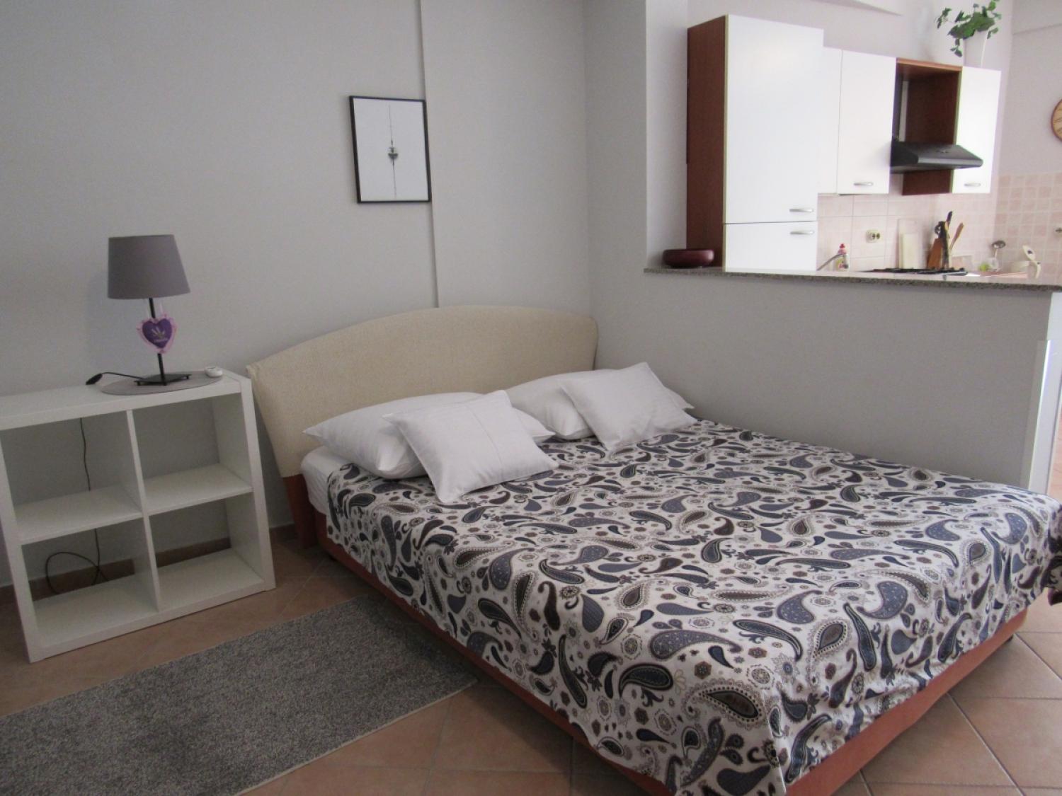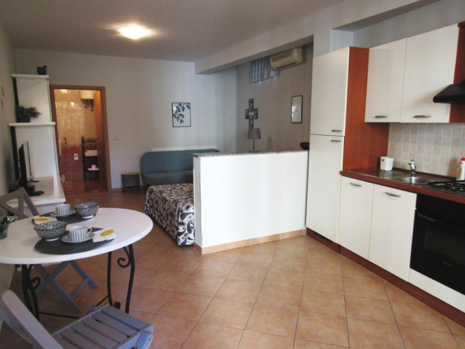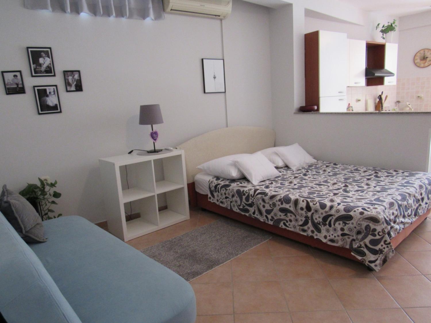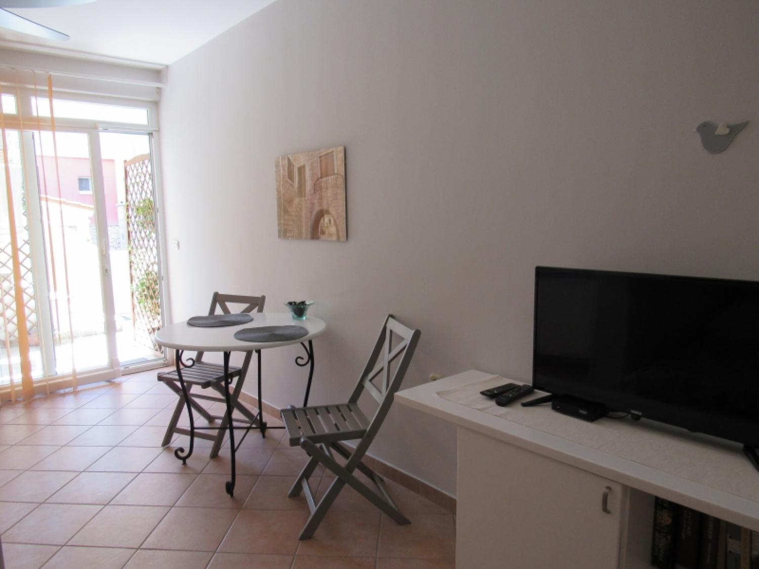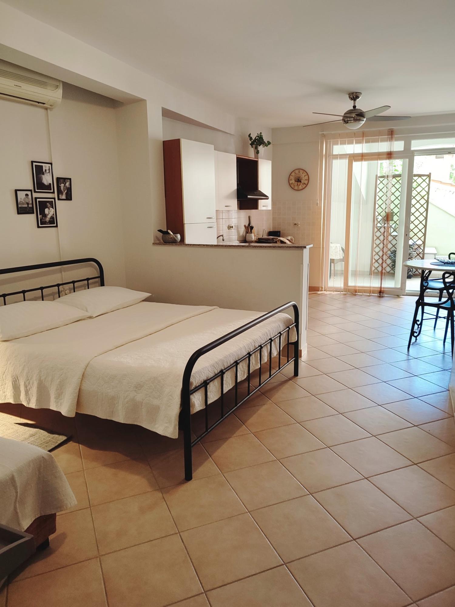 The apartment is one room divided into two parts, a bedroom area with a double and single bed, spacious bathroom, well equipped kitchen with dinning area and an outdoor terrace.