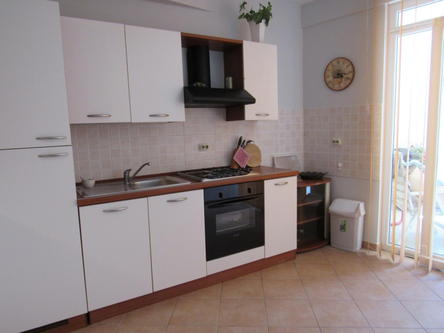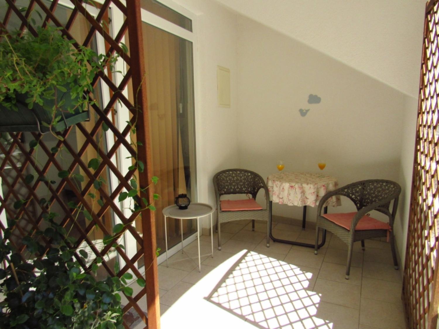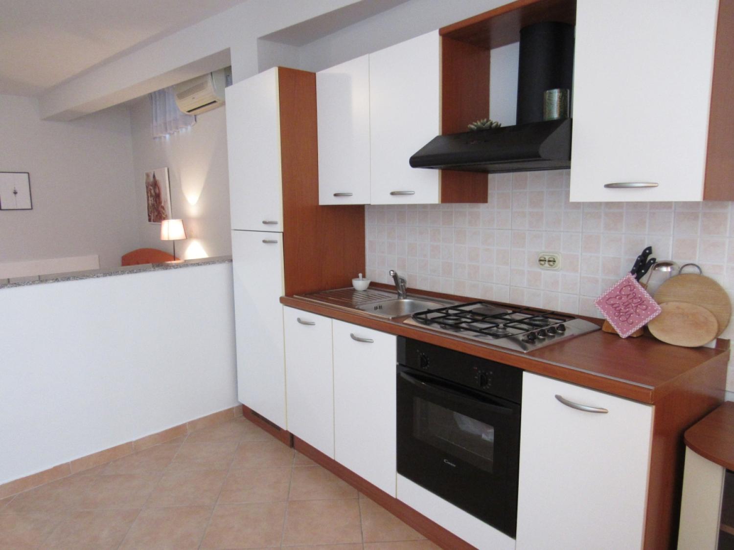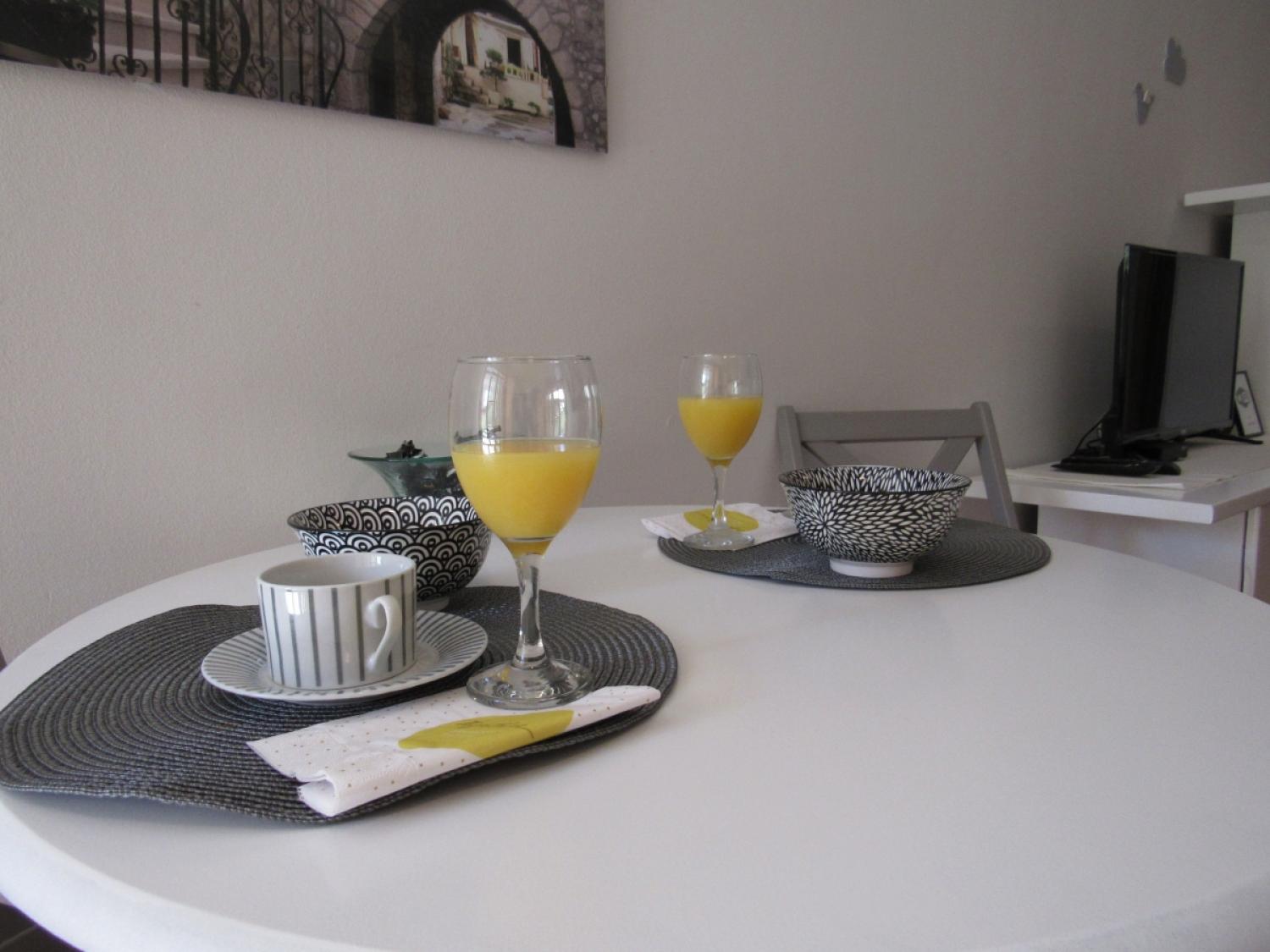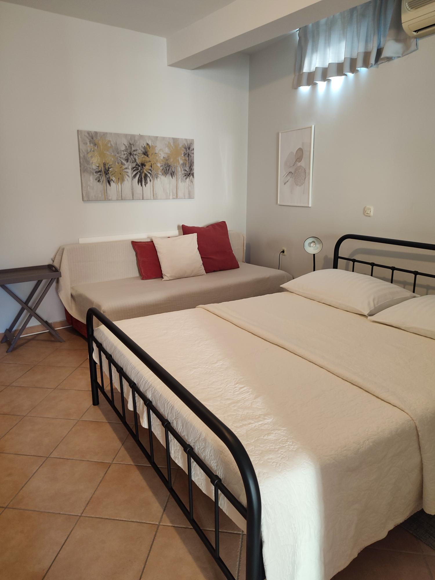 The apartment is one room divided into two parts, a bedroom area with a double and single bed, spacious bathroom, well equipped kitchen with dinning area and an outdoor terrace.