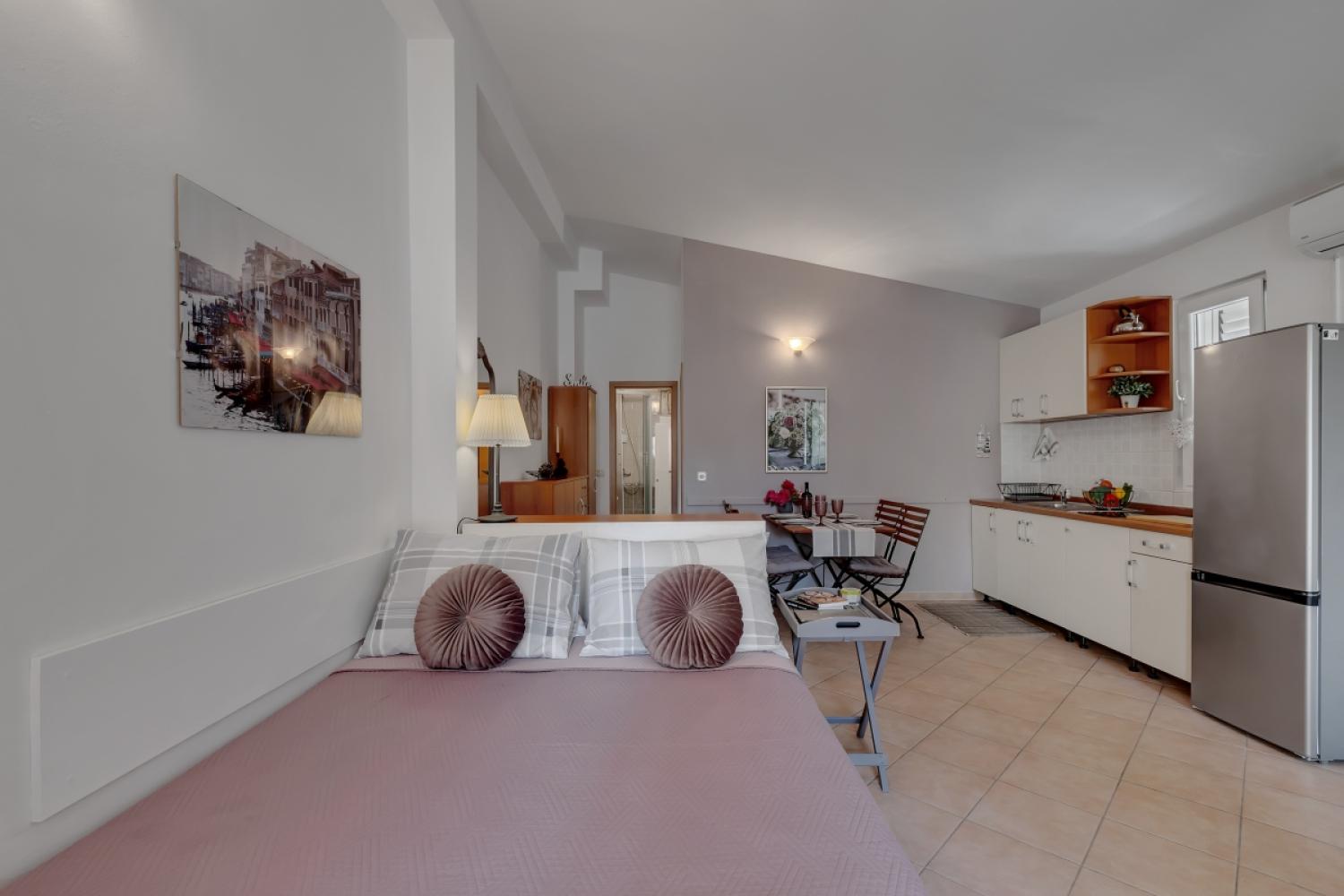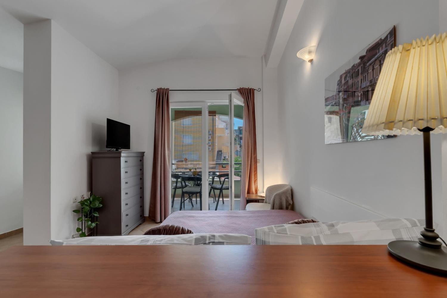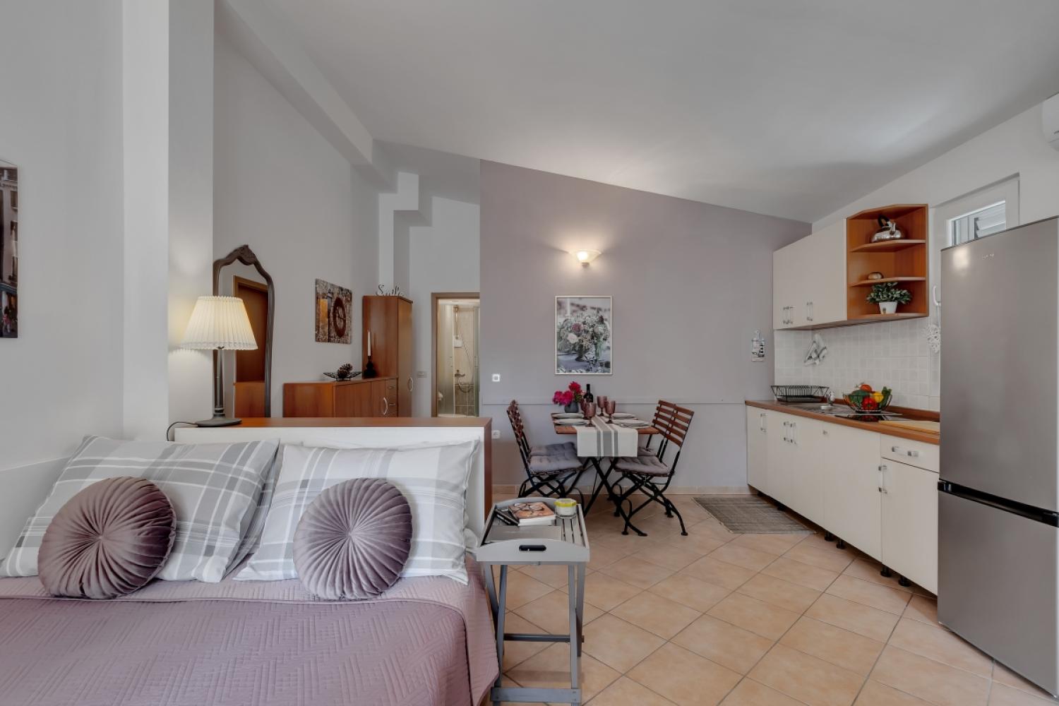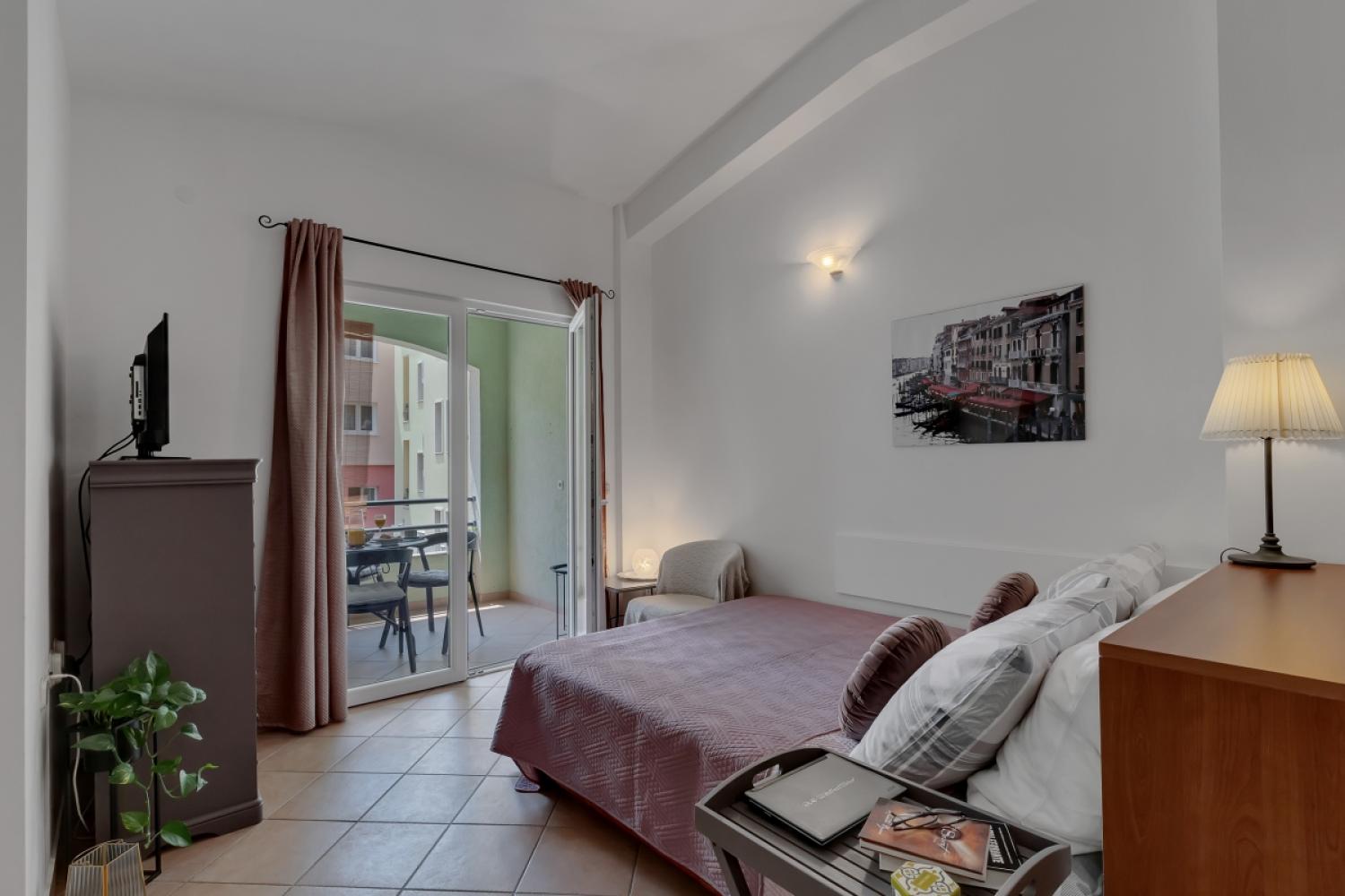 Apartmán má spálňu s manželskou posteľou, kúpeľňu so základnými toaletnými potrebami, obývaciu izbu s kuchynským kútom a balkón.