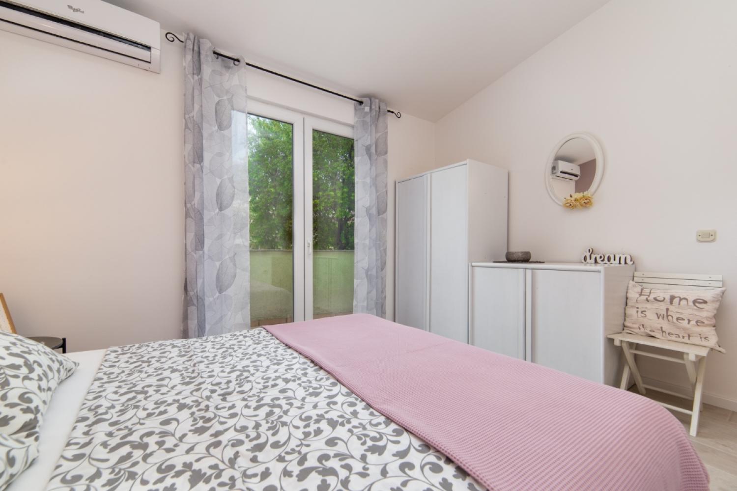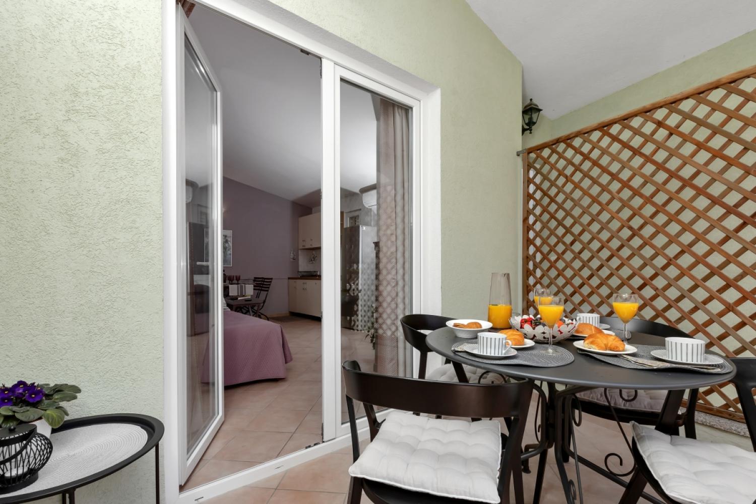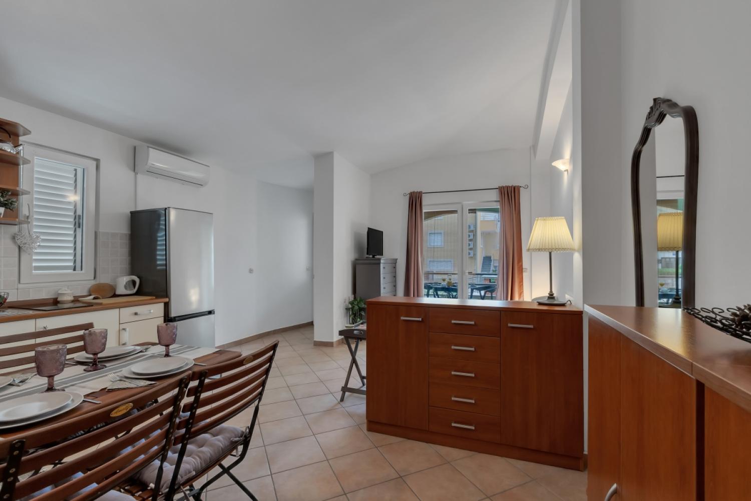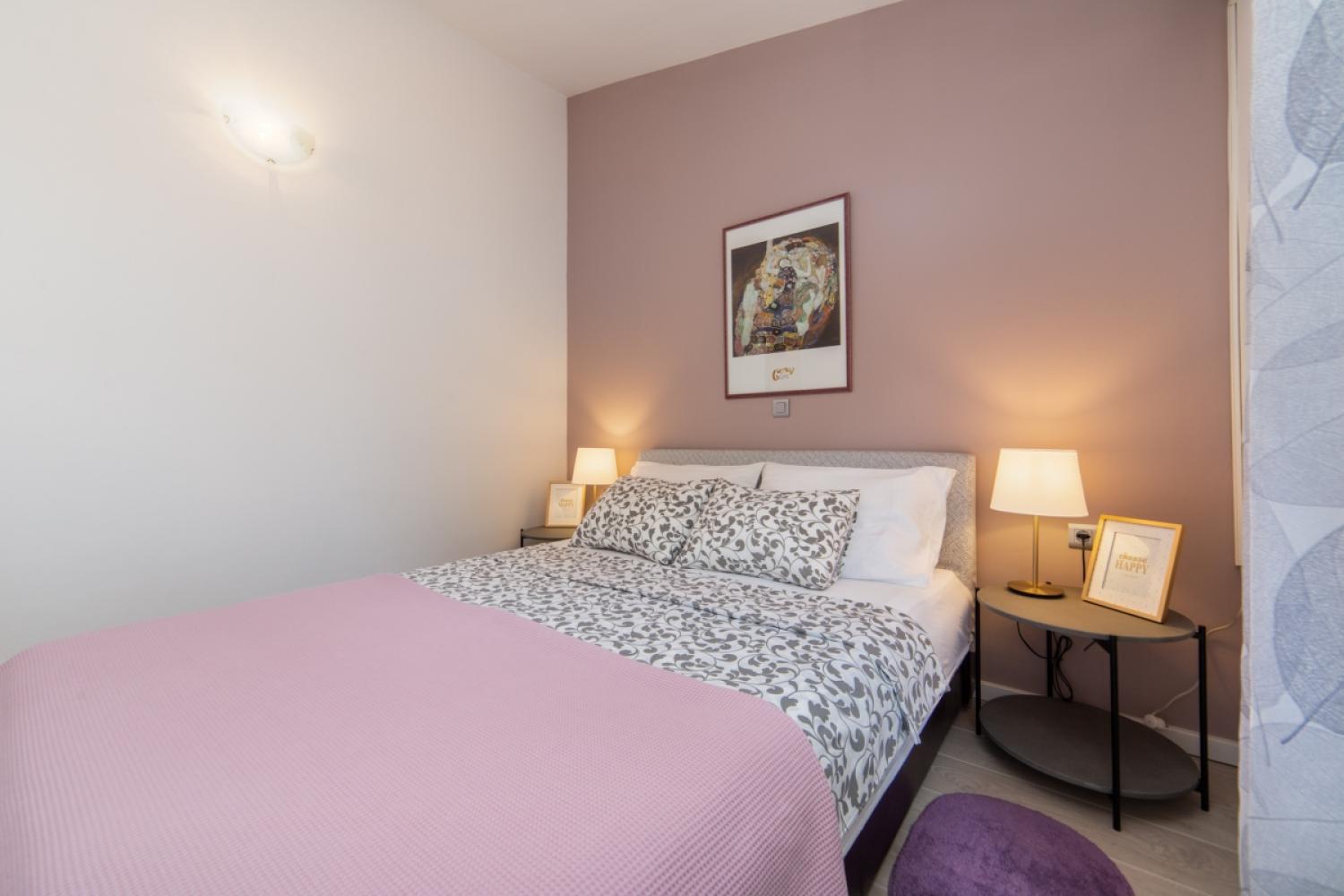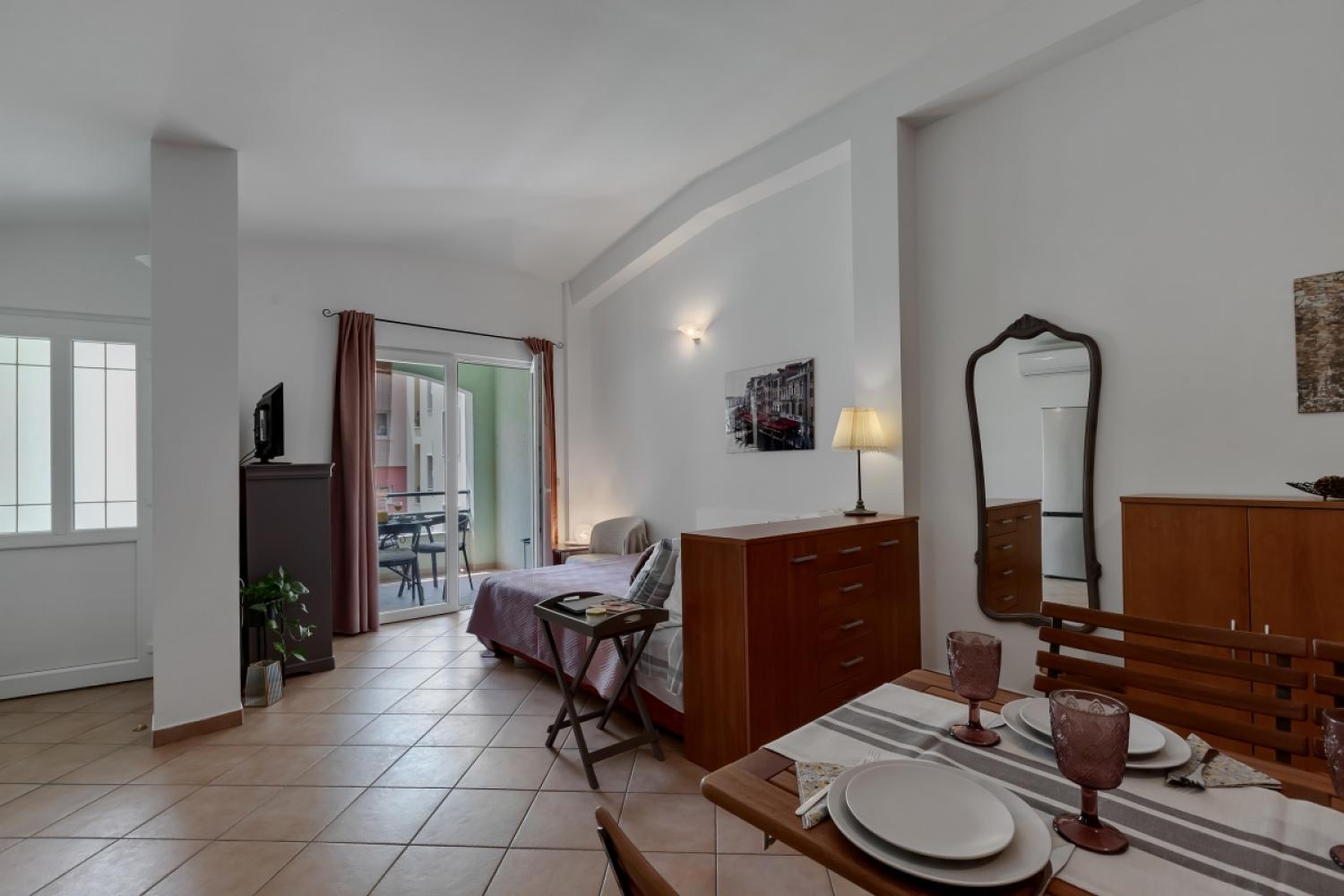 Apartmán má spálňu s manželskou posteľou, kúpeľňu so základnými toaletnými potrebami, obývaciu izbu s kuchynským kútom a balkón.
