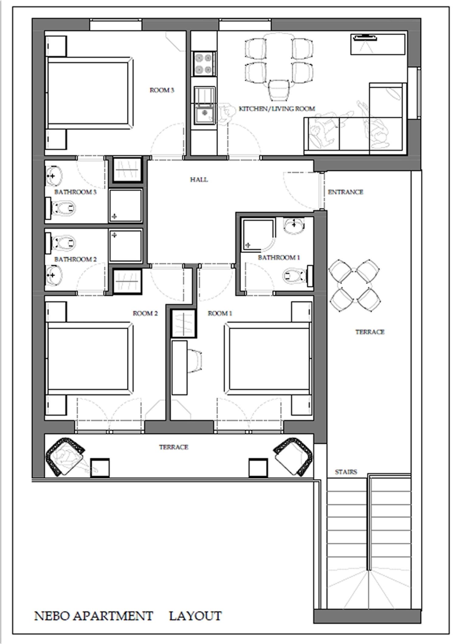 K dispozícii sú 3 dvojlôžkové spálne - každá s kúpeľňou, obývacia izba s kuchyňou, balkón a terasa.